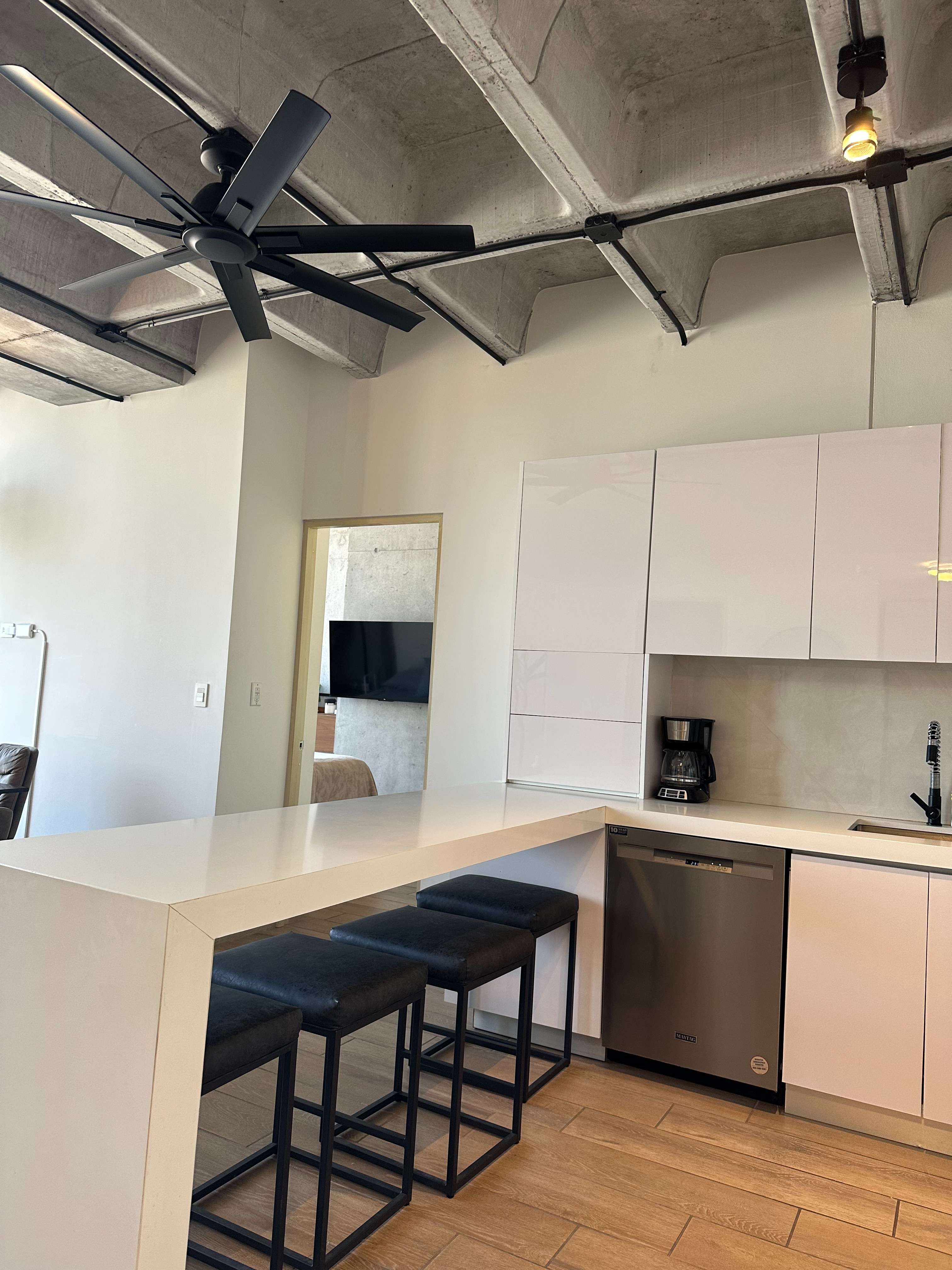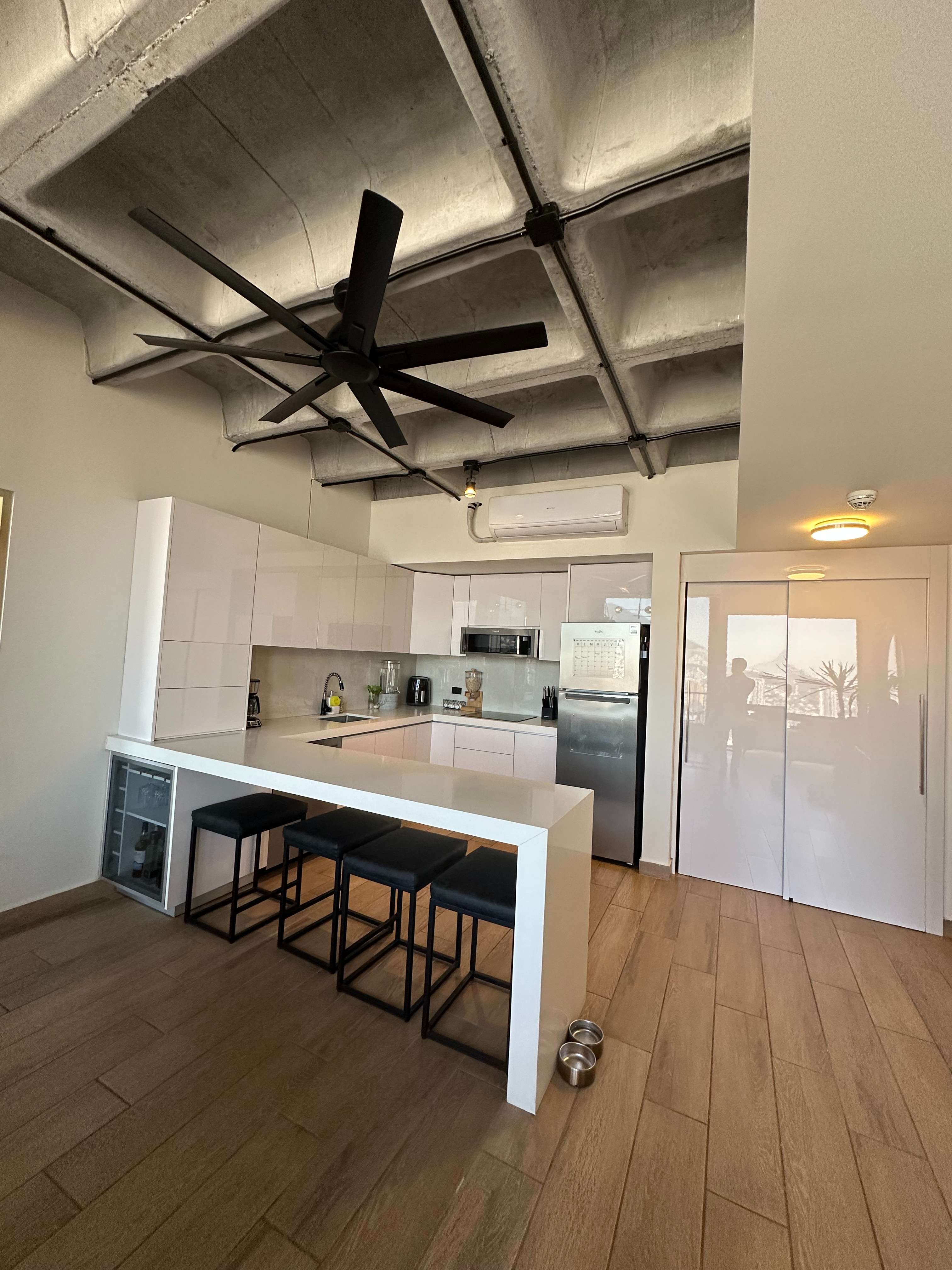 • Cocina integral con cubierta de cuarzo blanco y acabados en alto brillo
